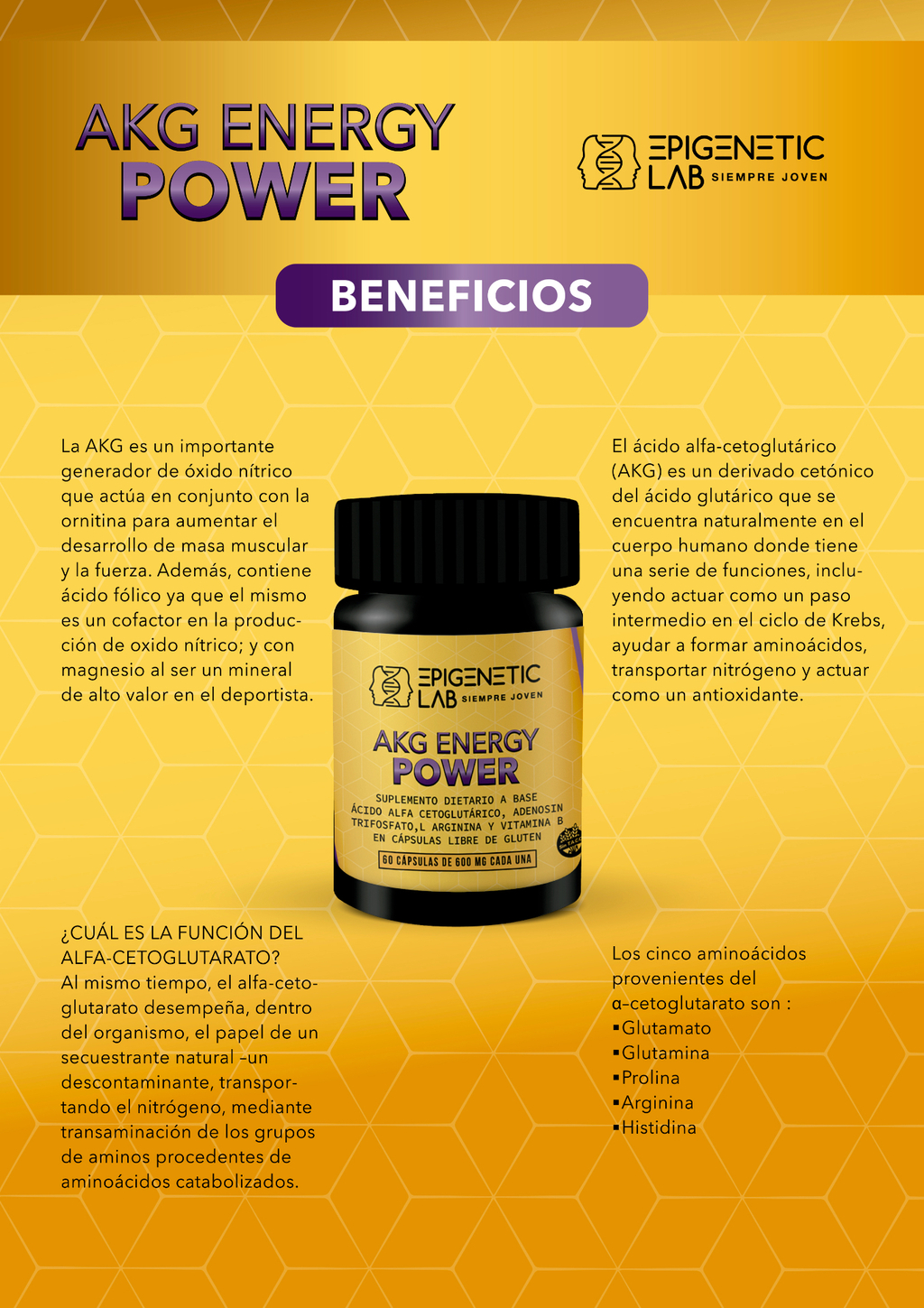 PRESENTACION 60 CAPSULAS DE 600 MG C/U LIBRE DE TACCTABLA NUTRICONAL CADA 2 CAPSULASAKG............................... 800 MGL ARGININA ................. 300 MG ATP ...............................   50 MGVITAMINA B6 .............    50 MG   INFO SOBRE EL SUPLEMENTO: FORMA DE TOMARLO: 2 CAPSULAS CON ABUNDANTE LIQUIDO EN AYUNAS 45 MIUNUTOS ANTES DE ENTRENARDATOS TECNICOS SOBRE LOS COMPONENTES Alpha-Ketoglutarato (AKG): Explorando los Beneficios de un Suplemento Prometedor El alpha-ketoglutarato (AKG), también conocido como ácido alfa-cetoglutárico, es un compuesto que desempeña un papel en el ciclo de Krebs, una serie de reacciones bioquímicas que tienen lugar en las células para producir energía. AKG ha sido objeto de investigación debido a sus  beneficios para la salud. Aquí hay algunos aspectos clave sobre los beneficios del alpha-ketoglutarato:  Producción de Energía:El AKG participa en el ciclo de Krebs, donde ayuda en la conversión de nutrientes, como carbohidratos, grasas y proteínas, en energía utilizable en forma de adenosín trifosfato (ATP). Esta función es esencial para el metabolismo energético celular.Antioxidante y Desintoxicación:Se ha sugerido que el AKG tiene propiedades antioxidantes y esta involucrado en procesos de desintoxicación celular. Ayuda a neutralizar los radicales libres y contribuye a la protección celular contra el estrés oxidativo.Apoyo a la Función Mitocondrial:El AKG ha mostrado tener efectos positivos en la función mitocondrial, las estructuras celulares responsables de la producción de energía. Mejorar la función mitocondrial es fundamental para la salud celular y la resistencia al estrés.Estimulación de la Síntesis Proteica:Algunas investigaciones sugieren que el AKG puede tener un papel en la estimulación de la síntesis proteica, lo que podría ser beneficioso para el mantenimiento y la reparación de los tejidos.Apoyo a la Salud Cardiovascular:Se ha explorado el potencial del AKG para mejorar la salud cardiovascular al influir en procesos como la función endotelial y la regulación de la presión arterial.Respuesta Inmunológica:Hay investigaciones que sugieren que el AKG puede modular la respuesta inmunológica, lo que podría tener implicaciones en la mejora de la función inmunológica y la resistencia a enfermedades.Efectos en la Longevidad:Algunos estudios han sugerido que el AKG podría tener efectos positivos en la longevidad, aunque se necesita más investigación para comprender completamente estos mecanismos. La combinación de L Arginina, adenosín trifosfato (ATP) y vitamina B6 ofrece varios beneficios:ArgininaVasodilatación: Mejora la circulación al aumentar la producción de óxido nítrico, lo que puede beneficiar la salud cardiovascular.Rendimiento físico: Puede mejorar la resistencia y el rendimiento en el ejercicio.Cicatrización: Favorece la reparación de tejidos y la cicatrización de heridas.Adenosín Trifosfato (ATP)Energía celular: Es la principal fuente de energía para las células, mejorando la función muscular y el rendimiento.Recuperación: Ayuda en la recuperación muscular después del ejercicio intenso.Fatiga: Puede reducir la sensación de fatiga durante actividades físicas.Vitamina B6Metabolismo energético: Participa en la conversión de alimentos en energía.Función cerebral: Apoya la salud cerebral y la producción de neurotransmisores.Producción de glóbulos rojos: Es crucial para la formación de hemoglobina.Combinación de los tresRendimiento deportivo: Esta combinación puede mejorar la resistencia, energía y recuperación muscular.Salud cardiovascular: Al mejorar la circulación y el metabolismo energético.Bienestar general: Promueve una mejor salud y función corporal.Consideraciones Importantes: Aunque los estudios sugieren beneficios potenciales, la investigación sobre el AKG está en sus etapas iniciales, y se necesitan más estudios clínicos para validar y comprender completamente sus efectos en humanos. Como con cualquier suplemento, es esencial hablar con un profesional de la salud antes de tomar AKG, especialmente si tienes condiciones médicas preexistentes o estás tomando otros medicamentos. En resumen, el alpha-ketoglutarato muestra promesas en varios aspectos relacionados con la salud celular, el metabolismo y la función sistémica, pero se requiere más investigación para determinar sus aplicaciones específicas y la dosificación adecuada.