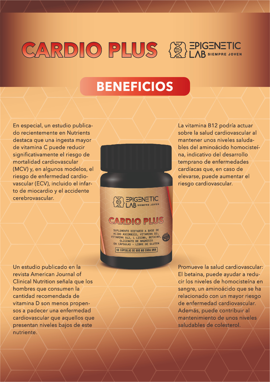 ENVASE POR 60 CAPSULAS DE 600 MG SIN TACC Potenciando la Salud Cardiaca: El Impacto Positivo de la Vitamina C, Vitamina B12, Lisina, Betaína y Glicinato de Magnesio El corazón es el motor de nuestro cuerpo, bombeando sangre y oxígeno a cada célula para mantenernos vivos y vibrantes. Sin embargo, el estilo de vida moderno, junto con factores como la mala alimentación y el estrés, puede poner en riesgo la salud cardiovascular. Afortunadamente, la naturaleza nos brinda una serie de nutrientes esenciales que pueden fortalecer y proteger nuestro corazón. Entre ellos se encuentran la vitamina C, la vitamina B12, la lisina, la betaína y el glicinato de magnesio, cuya combinación puede ofrecer una poderosa defensa contra las enfermedades cardíacas. Vitamina C: Un Escudo Antioxidante La vitamina C es conocida por su papel como antioxidante, neutralizando los radicales libres que pueden dañar las células y los vasos sanguíneos del corazón. Además, la vitamina C es necesaria para la síntesis de colágeno, una proteína estructural clave en las paredes arteriales. Al fortalecer estas estructuras, la vitamina C ayuda a mantener la elasticidad de los vasos sanguíneos y a reducir el riesgo de hipertensión y enfermedades cardiovasculares. Vitamina B12: Vital para la Salud del Corazón La vitamina B12 desempeña un papel crucial en la salud cardiovascular al ayudar en la metabolización de homocisteína, un aminoácido cuyos niveles elevados se han asociado con un mayor riesgo de enfermedades cardíacas. Al mantener los niveles de homocisteína bajo control, la vitamina B12 puede ayudar a prevenir la acumulación de placa en las arterias y reducir el riesgo de aterosclerosis y enfermedad coronaria. Lisina: Construyendo Bloques Cardíacos La lisina es un aminoácido esencial que desempeña un papel importante en la síntesis de colágeno y en la salud de las arterias. Se ha demostrado que la lisina ayuda a prevenir la acumulación de placa en las arterias al inhibir la adhesión de lipoproteínas de baja densidad (LDL) a las paredes arteriales. Además, la lisina puede mejorar la flexibilidad de las arterias y reducir la presión arterial, lo que contribuye a la salud general del corazón. Betaína: Estabilizando los Niveles de Homocisteína La betaína es un compuesto natural que se encuentra en una variedad de alimentos, incluyendo la remolacha y la espinaca. Se ha demostrado que la betaína ayuda a metabolizar la homocisteína, reduciendo así los niveles de este aminoácido y protegiendo la salud cardiovascular. Al mantener los niveles de homocisteína en un rango saludable, la betaína puede ayudar a prevenir la acumulación de placa en las arterias y reducir el riesgo de enfermedades cardíacas. Glicinato de Magnesio: Calmando el Corazón y los Vasos Sanguíneos El magnesio es un mineral crucial para la función cardíaca y vascular. El glicinato de magnesio es una forma altamente biodisponible de magnesio que se absorbe fácilmente en el cuerpo. Se ha demostrado que el magnesio ayuda a regular el ritmo cardíaco, reduce la presión arterial y mejora la función endotelial, lo que contribuye a la salud general del corazón y los vasos sanguíneos. Conclusión: Fortaleciendo el Corazón con Nutrientes Esenciales En conjunto, la vitamina C, la vitamina B12, la lisina, la betaína y el glicinato de magnesio ofrecen una poderosa combinación de nutrientes para promover la salud cardiovascular. Desde su acción antioxidante hasta su capacidad para regular los niveles de homocisteína y mejorar la función vascular, estos nutrientes trabajan en conjunto para fortalecer y proteger el corazón. Al incorporar estos nutrientes en nuestra dieta diaria o a través de suplementos, podemos dar un impulso adicional a la salud de nuestro corazón y disfrutar de una vida larga y activa.