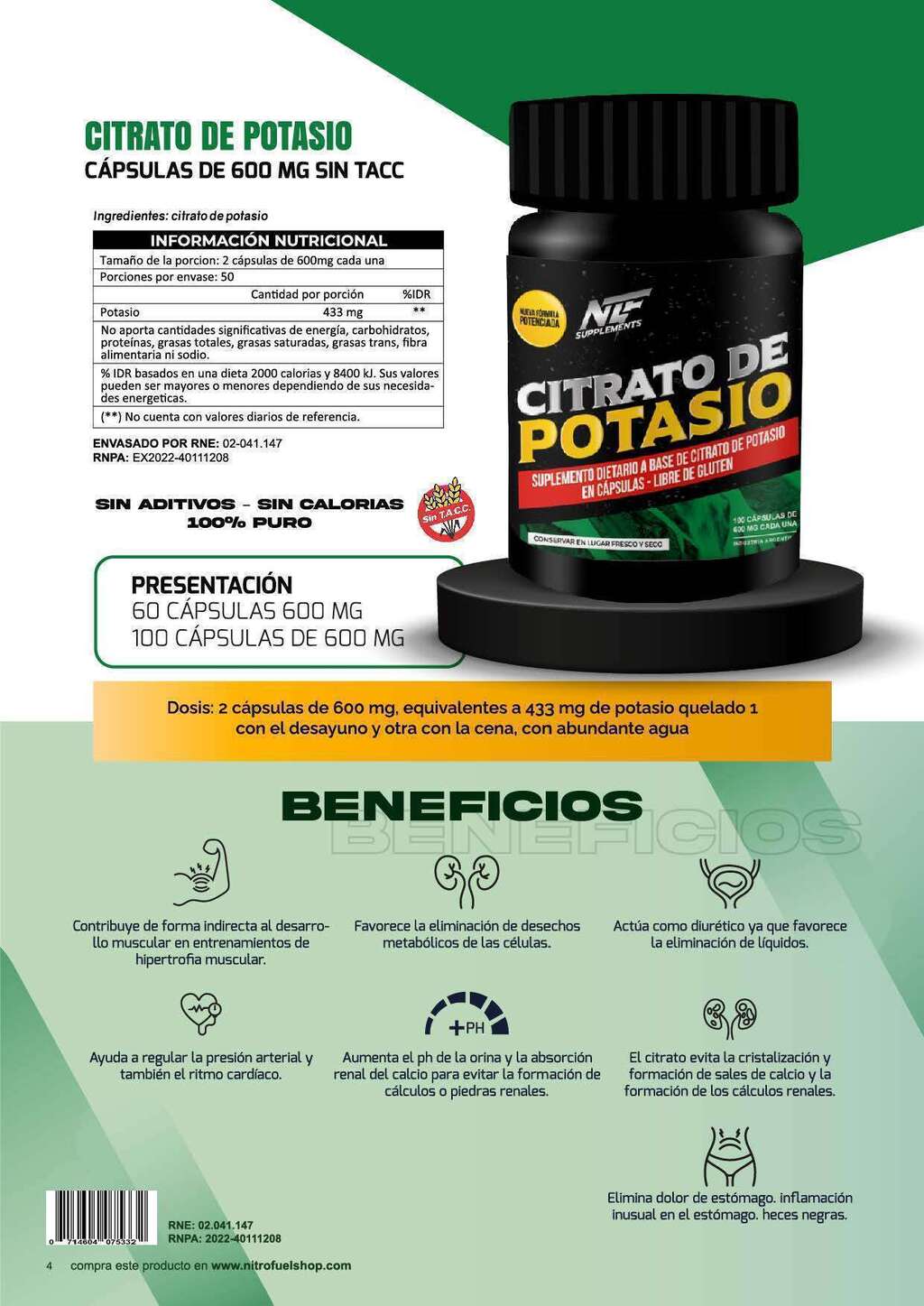 CITRATO DE POTASIO X 100 CAPSULAS DE 600 MG C/U SIN TACCRNE: 02.041.147RNPA: EX2022-40111208 DIYPA100% puro de rápida absorsión.SIN ADITIVOS - SIN CALORIAS - SIN EXCIPIENTESBeneficios:Potente alcalinizante.Reduce acidificación.Ayuda a los riñones a eliminar el ácido úrico.Mantiene el funcionamiento normal del sistema nervisio y muscular.Producto Sin T.A.C.C.Contiene 100 cápsulas de 600 mg cada una. Los Beneficios del Citrato de Potasio para la Salud: Más Allá de los RiñonesEl potasio es un mineral esencial que juega un papel crucial en numerosas funciones fisiológicas, desde el mantenimiento del equilibrio de líquidos y electrolitos hasta la contracción muscular y la señalización nerviosa. Si bien una dieta rica en frutas y verduras es la principal fuente de potasio, el citrato de potasio, una forma de suplemento, ha ganado atención por sus beneficios específicos para la salud. Aunque es más conocido por su impacto en la salud renal, sus propiedades se extienden a otros aspectos del bienestar.1. Prevención de Cálculos Renales (Litiasis Renal)Este es, sin duda, el beneficio más estudiado y reconocido del citrato de potasio. Actúa de varias maneras para prevenir la formación de cálculos renales, especialmente los de oxalato de calcio y ácido úrico:Alcalinización de la Orina: El citrato de potasio aumenta el pH de la orina, haciéndola menos ácida. Una orina más alcalina dificulta la cristalización y precipitación de sales como el oxalato de calcio y el ácido úrico, que son los componentes principales de muchos cálculos.Aumento del Citrato Urinario: El citrato es un potente inhibidor de la formación de cálculos. Se une al calcio en la orina, impidiendo que este se combine con el oxalato para formar cristales insolubles. Al aumentar los niveles de citrato en la orina, el citrato de potasio reduce la sobresaturación de las sales formadoras de cálculos.Para personas con antecedentes de cálculos renales recurrentes o condiciones que predisponen a su formación (como la acidosis tubular renal), el citrato de potasio es a menudo una terapia de primera línea.2. Mantenimiento de la Densidad ÓseaEl equilibrio ácido-base del cuerpo es fundamental para la salud ósea. Una dieta occidental típica, a menudo rica en proteínas animales y granos refinados, puede generar una carga ácida neta en el organismo. Para neutralizar este exceso de ácido, el cuerpo puede recurrir a las reservas de calcio de los huesos.El citrato de potasio, al ser una fuente de potasio alcalinizante, puede ayudar a neutralizar esta carga ácida. Al hacerlo, se reduce la necesidad de movilizar el calcio óseo para fines de amortiguación, lo que teóricamente puede contribuir a preservar la densidad mineral ósea y reducir el riesgo de osteoporosis.3. Apoyo a la Salud CardiovascularEl potasio es vital para la salud del corazón y los vasos sanguíneos. Contribuye a:Regulación de la Presión Arterial: Un consumo adecuado de potasio se asocia con una presión arterial más baja. Ayuda a contrarrestar los efectos del sodio, que eleva la presión arterial, al promover la excreción de sodio y relajar las paredes de los vasos sanguíneos.Función Muscular Cardíaca: El potasio es un electrolito clave para el correcto funcionamiento de las células musculares cardíacas, contribuyendo a mantener un ritmo cardíaco regular y saludable.Aunque la mayoría de los estudios sobre potasio y salud cardiovascular se refieren al potasio dietético, el citrato de potasio puede ser una opción para aumentar la ingesta de este mineral en individuos que no alcanzan los niveles adecuados a través de la dieta.4. Equilibrio de Electrolitos y Función MuscularComo fuente de potasio, el citrato de potasio contribuye al mantenimiento del equilibrio de electrolitos en el cuerpo. Este equilibrio es fundamental para:Transmisión Nerviosa: El potasio es esencial para la generación y transmisión de impulsos nerviosos.Contracción Muscular: Es un electrolito clave para la contracción normal de los músculos, incluyendo el músculo cardíaco y los músculos esqueléticos. La deficiencia de potasio puede llevar a debilidad muscular y calambres.Consideraciones Importantes:Si bien el citrato de potasio ofrece varios beneficios, es crucial recordar que no es adecuado para todos. Su uso debe ser siempre bajo supervisión médica, especialmente en personas con:Insuficiencia renal: Los riñones son los encargados de excretar el exceso de potasio. En caso de insuficiencia renal, el potasio puede acumularse a niveles peligrosos (hiperpotasemia), lo que puede ser fatal.Enfermedades cardíacas: Aunque el potasio es bueno para el corazón, un exceso o un desequilibrio pueden ser perjudiciales.Uso de ciertos medicamentos: Algunos medicamentos (como los diuréticos ahorradores de potasio o los inhibidores de la ECA) pueden elevar los niveles de potasio en la sangre, lo que requiere precaución al suplementar con citrato de potasio.Conclusión:El citrato de potasio es un suplemento valioso, particularmente en la prevención de cálculos renales y en el apoyo al equilibrio ácido-base del cuerpo, lo que tiene implicaciones positivas para la salud ósea y cardiovascular. Sin embargo, como con cualquier suplemento, la clave está en la individualización. Es imperativo consultar a un médico o un nutricionista antes de iniciar cualquier suplementación con citrato de potasio para asegurar que sea seguro y apropiado para sus necesidades de salud específicas. Una dieta equilibrada, rica en potasio a través de alimentos integrales, sigue siendo la piedra angular de una buena salud.