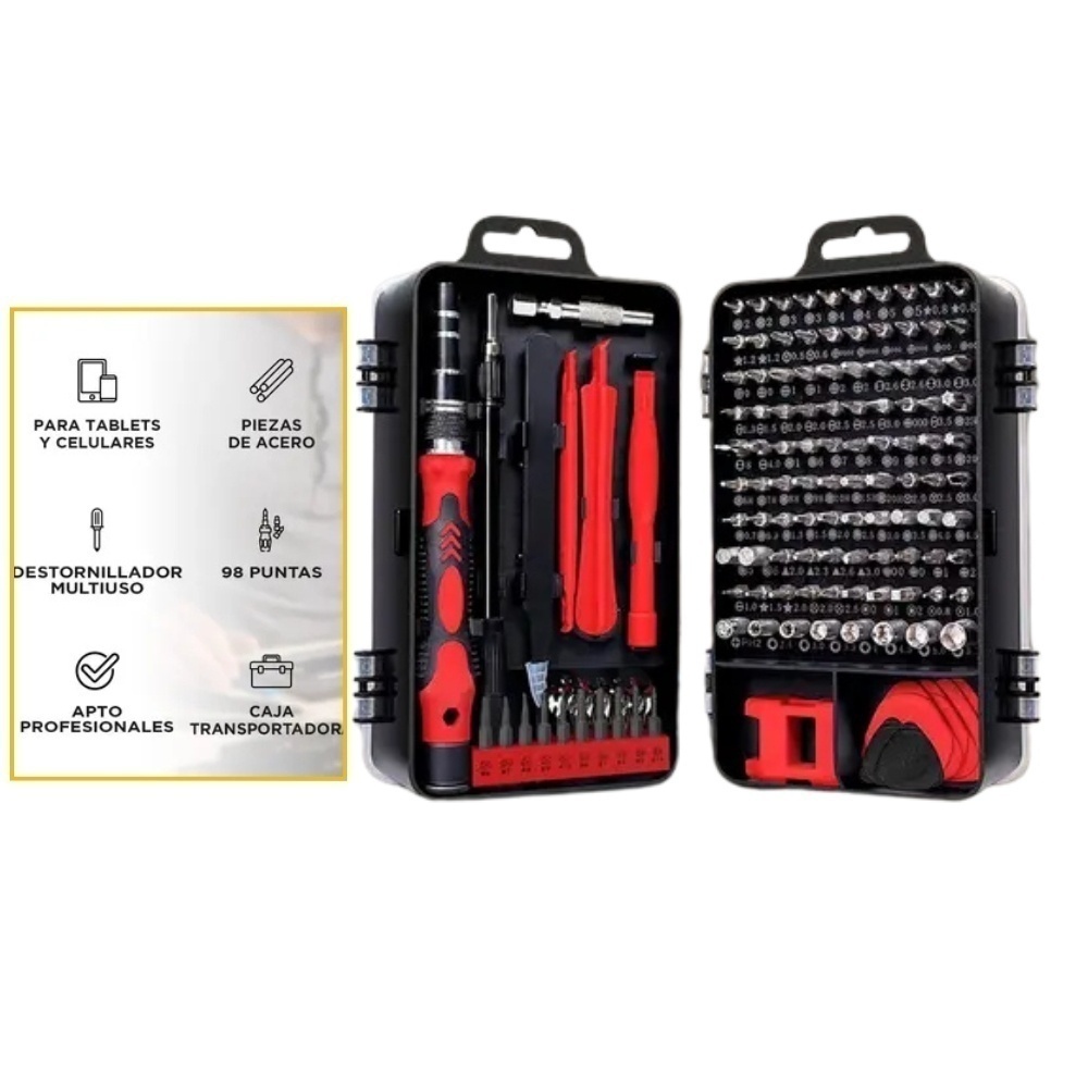 COLOR SUJETO A DISPONIBILIDAD.Kit Herramientas Precision 115 En 1 Celulares  Pro' es un set de precisión diseñado de manera profesional y práctica. Su aspecto es hermoso y es fácil de llevar. Los mangos están diseñados de acuerdo con la forma de la mano de la mecánica del cuerpo humano y agregan una tapa trasera en espiral para que la operación sea más cómoda y ahorre mano de obra. Los lotes de trajes están diversificados, adecuados para el desmontaje de varios artículos, confiables y duraderos.Especificaciones:• Material: Destornillador de mango de plástico• Tamaño: Abrazadera: 122 mm / 4.8 ", agarre: 98 mm / 3.86", lote: 26-28 mm / 1.02-1.1 "(imagen de referencia de tamaño específico)Detalles del juego de destornilladores 115-IN-1:• 17 accesorios de desmontaje• 1 x mango• 1 x eje de extensión flexible• 1 x barra de extensión• 1 x pinzas• 3 herramientas de palanca de plástico• 1 x extracción de tarjeta SIM para• 1 x magnetizador / desmagnetizador• 1 x ventosa• 6 x púas de apertura• 1 x Portabrocas para destornillador eléctrico• 98 puntas de destornillador• Phillips: 2 PH0000 2 PH000 2 PH00 2 PH0 2 PH1 2 PH2• Ranurado: SL1.0 SL1.3 SL1.5 2 SL2.0 2 SL2. 5 SL3.0 SL3.5 SL4.0• Trox: T1 2 T2 2 T3 2 T4 2 T5 T6 T7 T8 T9 T10 T15 T20• Pentagonal: 2 P2 0.8 2 P5 1.2 P6 1.5 P8 2.0• Hex: H0.7 H0.9 H1.3 H1.5 H2.0 H2.5 H3.0 H3.5 H4.0 H4.5 H5 H6• POZI: PZ000 PZ00 PZ0 PZ1 PZ2• Tri-punto: 2 Y0.6 Y2.0 Y2.5 Y3.0• Triángulo: 2.0 2.3 2.6 3.0• Forma de “U”: 2 U2.6 2 * U3.0 U8• Cuadrado: S0 S1 S2• MEDIO: W2.0 W2.0• SIM: 0.8 1.0• 4MM Zócalo: M2.5 M3.0 M3.5 M4.0 M4.5 M5.0 M5.5• ICS: PH2