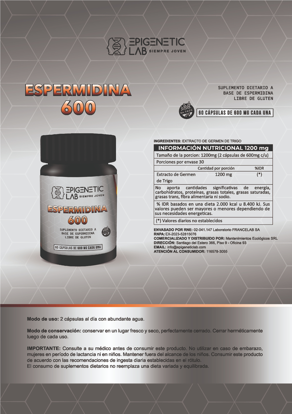 ESPERMIDINA 600 X 60 CAPSULAS DE 600 MG SIN TACC RNPA: 2023-52815076RNE: FRANCELAB SATABLA NUTRICIONAL CADA 2 CAPSULAS DE 600 MGEXTRACTO DE GERMEN DE TRIGO....................................1200 MGDOSIS: 2 CAPSULAS AL DIA CON EL DESAYUNO INFORMACIONTECNICA Beneficios de la Espermidina:Un Elixir para la Longevidad y la Salud En la búsqueda de la fuente de la juventud y la longevidad, los científicos han dirigido su atención hacia un compuesto sorprendente y prometedor: la espermidina. Esta molécula, que se encuentra naturalmente en una variedad de alimentos y en el cuerpo humano, ha sido objeto de intensa investigación debido a sus potenciales beneficios para la salud, que van desde la protección celular hasta la mejora de la función cognitiva. Vamos a explorar más a fondo los fascinantes beneficios de la espermidina y su impacto en la promoción de una vida larga y saludable.¿Qué es la Espermidina? La espermidina es un poliaminoácido que se encuentra ampliamente en la naturaleza, tanto en alimentos vegetales como animales, así como en el cuerpo humano. Es un polímero de la L-ornitina y se sintetiza a partir de aminoácidos esenciales. La espermidina desempeña varios roles importantes en el cuerpo, incluyendo la regulación del ciclo celular, la protección del ADN, y la modulación de la respuesta inmunitaria.Beneficios de la Espermidina para la Salud Longevidad y Envejecimiento Saludable: Numerosos estudios han demostrado que la espermidina puede tener efectos positivos en la longevidad y el envejecimiento saludable. Se ha observado que la suplementación con espermidina prolonga la vida útil en una variedad de organismos, desde levaduras hasta ratones. Además, se cree que la espermidina ayuda a proteger contra el estrés oxidativo y la inflamación, dos procesos asociados con el envejecimiento y las enfermedades relacionadas con la edad. Protección del Corazón y los Vasos Sanguíneos: La espermidina puede tener beneficios significativos para la salud cardiovascular al ayudar a reducir la presión arterial, mejorar la función endotelial y prevenir la formación de placa en las arterias. Se ha sugerido que la espermidina puede tener efectos protectores contra enfermedades cardiovasculares como la aterosclerosis y el accidente cerebrovascular. Mejora de la Función Cognitiva: Estudios recientes han sugerido que la espermidina puede tener efectos positivos en la función cognitiva y la salud del cerebro. Se ha demostrado que la espermidina mejora la plasticidad sináptica, promueve la formación de nuevas conexiones neuronales y protege contra el daño neuronal, lo que puede tener implicaciones para el tratamiento y la prevención de enfermedades neurodegenerativas como el Alzheimer y el Parkinson. Modulación del Sistema Inmunitario: La espermidina juega un papel importante en la regulación del sistema inmunitario, ayudando a modular la respuesta inflamatoria y mejorar la función de las células inmunitarias. Se ha sugerido que la espermidina puede tener efectos beneficiosos en enfermedades autoinmunes, alergias y otros trastornos relacionados con el sistema inmunitario. Fuentes de Espermidina La espermidina se encuentra naturalmente en una variedad de alimentos, especialmente en aquellos que son ricos en proteínas, como el queso, la carne, el pescado y los productos de soja. Además, ciertos alimentos vegetales, como los guisantes, los champiñones y los gérmenes de trigo, también son buenas fuentes de espermidina. Además de obtener espermidina a través de la dieta, también se está investigando la posibilidad de utilizar suplementos de espermidina para aumentar su ingesta y aprovechar sus beneficios para la salud.Conclusión La espermidina emerge como un compuesto fascinante con el potencial de promover una vida larga y saludable. Desde sus efectos en la longevidad y el envejecimiento saludable hasta su protección del corazón, el cerebro y el sistema inmunitario, la espermidina ofrece una amplia gama de beneficios para la salud que hacen que valga la pena prestarle atención. Al incluir alimentos ricos en espermidina en nuestra dieta y, posiblemente, considerar la suplementación, podemos aprovechar todo el potencial de este elixir para la longevidad y disfrutar de una vida vibrante y plena.