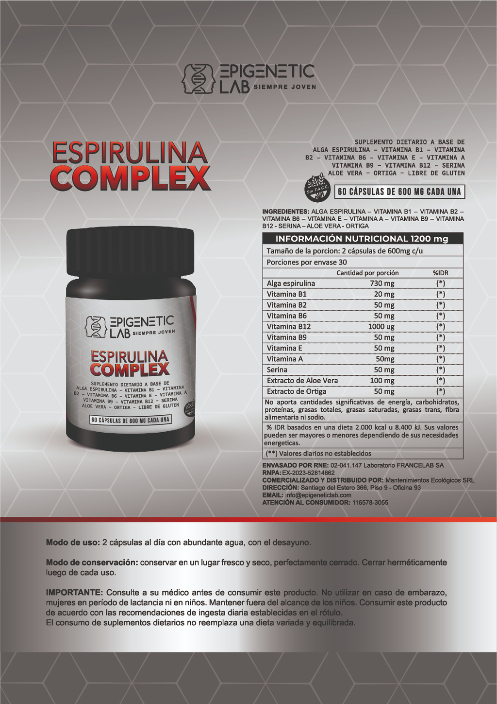 ESPIRULINA COMPLEX B POR 60 CAPSULAS DE 600 MG SIN TACC