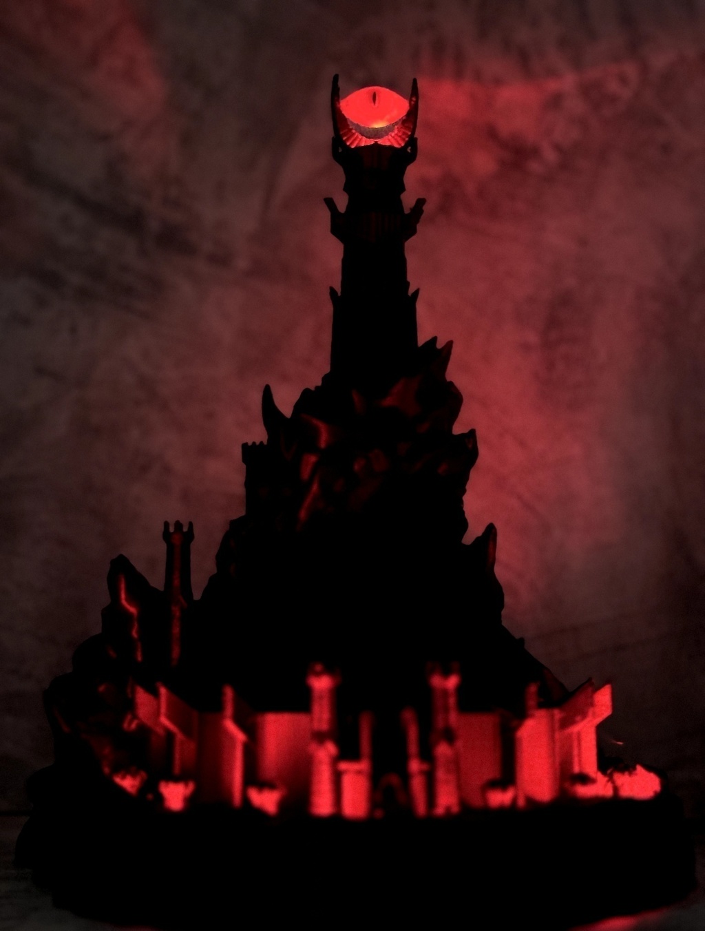 Lámpara Barad-Dur (ojo de Sauron)Ilumina tu hogar con la Lámpara Barad-Dur, una pieza única realizada mediante impresión 3D de plástico que combina arte y tecnología. Este diseño exclusivo hará que cualquier espacio se transforme en un ambiente mágico y cautivador.Características:Eléctrica y lista para usar: Incluye una tira LED fija en su interior, que garantiza una iluminación eficiente y duradera.Fuente de alimentación incluida: Viene con una fuente para enchufar en la corriente, facilitando su uso inmediato.Dimensiones: Alto 23 cm - Diámetro inferior 18 cm, ¡ideal para cualquier rincón de tu hogar!Con su diseño innovador y funcional, la Lámpara Barad-Dur no solo es una fuente de luz, sino también una pieza decorativa que atraerá todas las miradas. No te pierdas la oportunidad de tener esta lámpara emblemática y transforma tu espacio en un reino de fantasía. ¡Adquiere la tuya ahora y dale un toque especial a tu hogar!