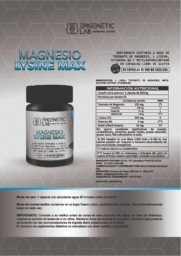 X 60 CAPSULAS DE 600 MG FORMULA OPTIMIZADA DEL Dr Ludwig Johnson RNE: 02.041.147 RNPA: EX-2023-52628708 DOSIS UNA CAPSULA 45 MINUTOS ANTES DE DORMIRBENEFICIOSMAGNESIO LYSINE MAX contiene Lisina L Tiene un efecto potencial antiviral, antiosteoporótico, cardiovascular e hipolipemiante, Promueve, además, la absorción de calcio y es esencial para la producción de carnitina y la formación de colágeno.¿Qué hace la lisina en el cerebro?La lisina desempeña un papel en la producción de neurotransmisores en el cerebro, incluyendo la serotonina, que está relacionada con el bienestar emocional. Algunos estudios sugieren que la lisina puede ayudar a reducir la ansiedad y el estrés.El Magnesio + Lisina - Reduce la ansiedad y otros síntomas psicológicos. - Reduce la inflamación del Páncreas (pancreatitis). - Útil en la producción de anticuerpos. - Estimula la hormona del crecimiento.MSMMSM para la osteoartritis. También se usa para el dolor, la hinchazón, el envejecimiento de la piel, la fiebre del heno y muchas otras condiciones.