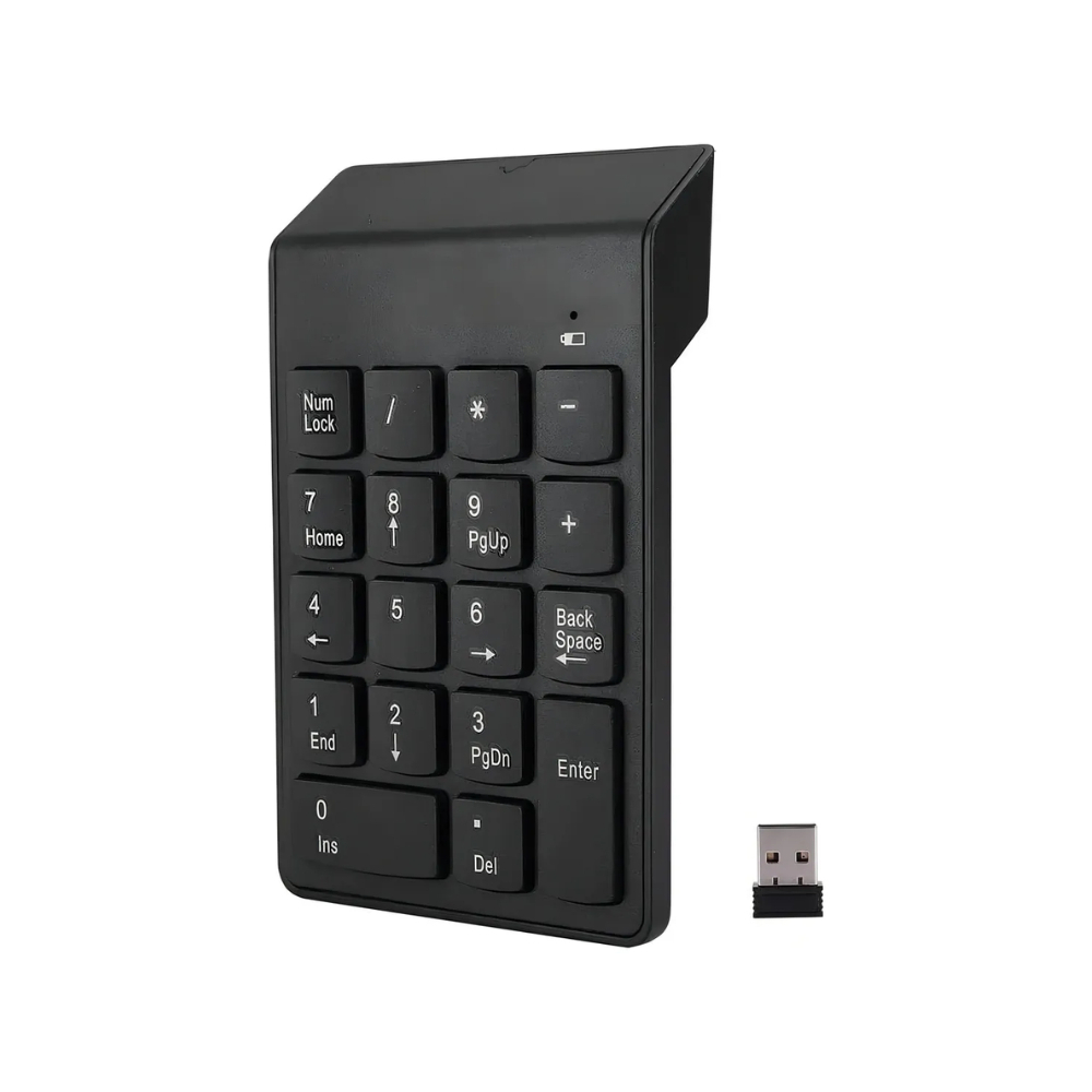 Teclado numérico inalámbrico de 18 teclas con mini receptor USB de 2.4G.18 teclas de tamaño completoCon 18 teclas silenciosas de tamaño completo, el teclado numérico inalámbrico es fácil de identificar, ayuda a obtener una entrada de datos numérica rápida y precisa. Incluyendo tecla de retroceso, bloqueo numérico, Entrar, Página abajo, Página arribaInalámbrico de 2.4 GHz, Plug & PlayEl teclado numérico para portátil adopta tecnología inalámbrica avanzada de 2.4 GHz, plug and play con mini receptor USB, transmisión de datos rápida, sin demora y sin caton. Las distancias de trabajo son de hasta 33 pies (32.8 ft).Diseño ergonómico de 15°La gran inclinación ergonómica hace que esta unidad USB sea perfecta para uso todo el día sin fatiga o molestias en la muñeca. Las teclas de perfil bajo pueden ayudar a reducir el ruido de escritura para una experiencia de trabajo cómoda y silenciosa.Delgado y compactoEl teclado externo para portátil es elegante y delgado y bastante ligero por su tamaño, lo que es bastante práctico de llevar contigo. Utilice la batería AAA (no incluida) para la alimentación, conveniente y confiable.