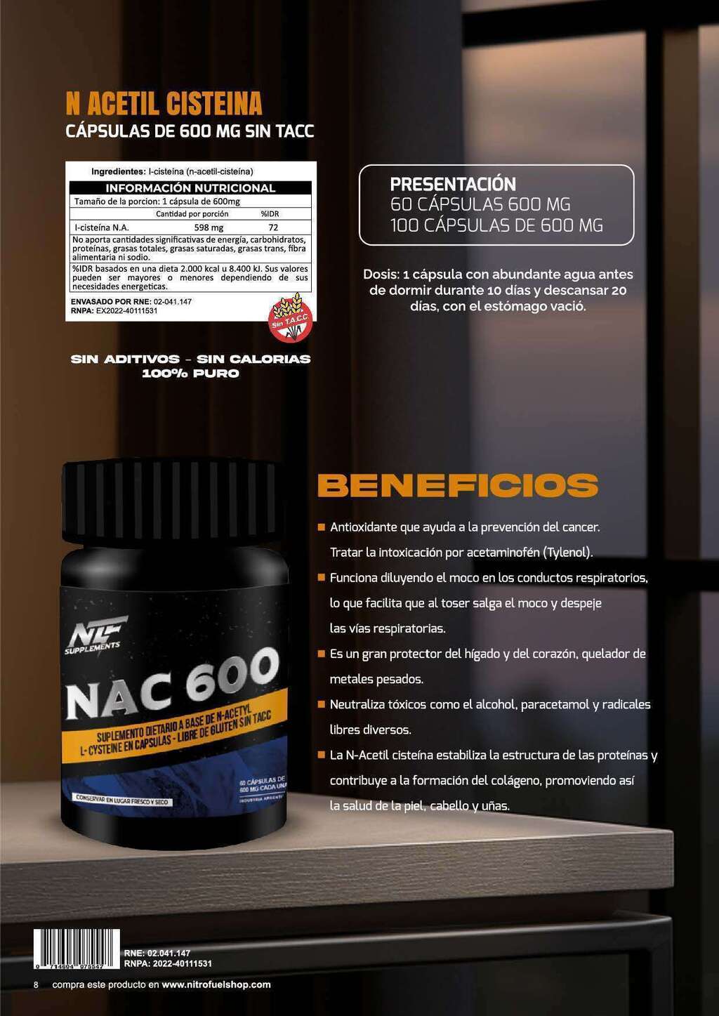 N-ACETIL CISTEINA x 60 capsulas de 600 mg   ¿Qué es la N-acetilcisteína y para qué sirve? N-Acetil Cisteína (NAC) es una forma alterada del aminoácido L-cisteína. Este es uno de los pocos aminoácidos que contener azufre. NAC tiene un fuerte olor a azufre, que es completamente normal. La N-acetilcisteína (NAC) proviene del aminoácido L-cisteína. Los aminoácidos son componentes básicos de las proteínas. NAC tiene muchos usos y es un medicamento aprobado por la FDA. La N-acetilcisteína es un antioxidante que podría desempeñar un papel en la prevención del cáncer.   ¿Cómo saber si soy alérgico a la N Acetilcisteina? Reacción alérgica: Comezón o ronchas, hinchazón del rostro o las manos, hinchazón u hormigueo en la boca o garganta, opresión en el pecho, dificultad para respirar. Salpullido con o sin fiebre. Vómito severo o progresivo.   ¿Qué alimentos tienen N-acetilcisteína? La cisteína se halla en la mayoría de alimentos altamente proteicos como son las fuentes animales (cerdo, carne picada, pollo, pavo, pato, huevos, leche, etc). También se pueden encontrar en las plantas del género Allium como ajo, cebolla o puerro.   ¿Cuál es la mejor hora para tomar NAC? Se recomienda ingerir N-Acetilcisteína con el estómago vacío, ya que debido a sus efectos quelantes puede reducir la biodisponibilidad de algunos minerales. Por esta razón, se recomienda realizar las tomas un mínimo de 2 horas antes o después de la ingesta de alimentos.   ¿Qué beneficios tiene la acetilcisteína? Pues bien, los beneficios de esta sustancia van mucho más allá de la tos. Nos ayuda a fabricar el antioxidante más importante del cuerpo, el glutatión, y además puede ayudar en afecciones respiratorias crónicas, problemas de fertilidad, enfermedades neurodegenerativas y prevención de otras enfermedades crónicas.   ¿Cuánto tiempo puedo tomar el NAC? En los casos en los que se consume sin receta, se debe usar durante 5 o 10 días como máximo por mes.