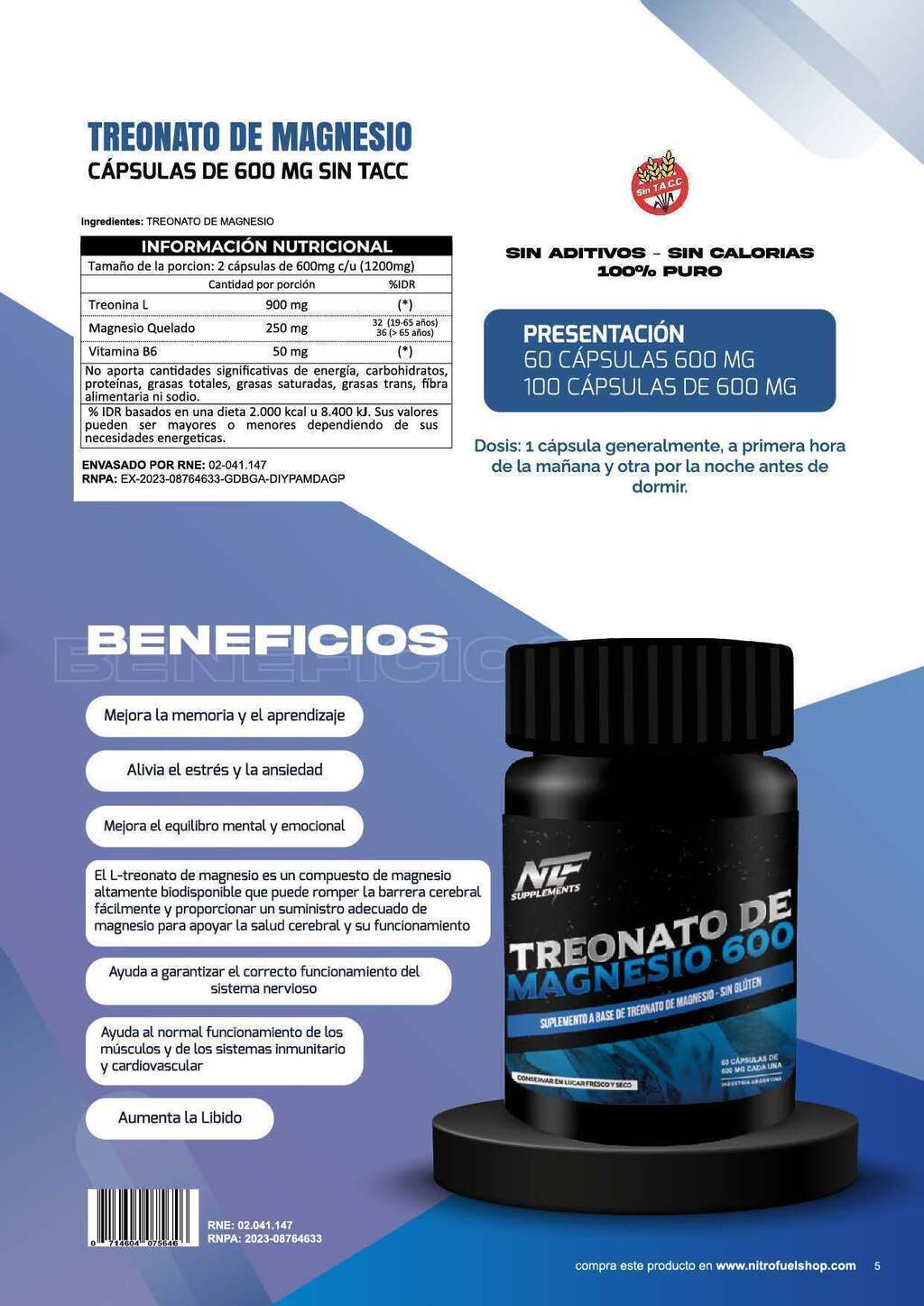 TREONATO DE MAGNESIO X 100 CAPSULAS DE 600 MG