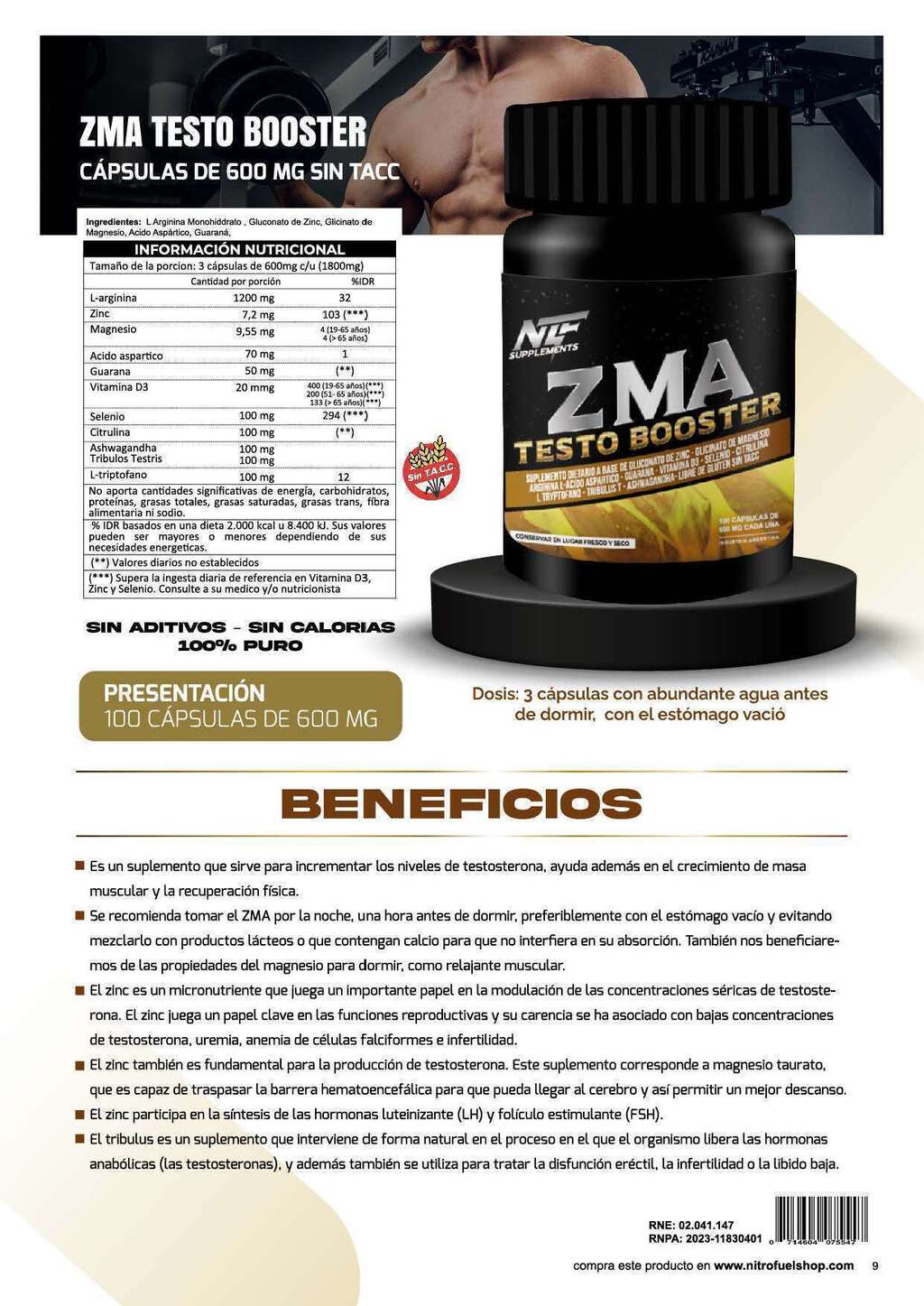 ZMA TESTO BOOSTER X 100 CAPSULAS DE 600 MG SIN TACC UNICO APROBADO EN ARGENTINA CON 11 MATERIAS PRIMAS